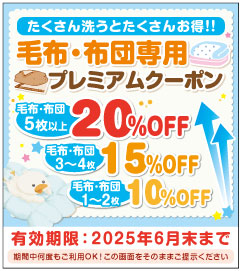 【6月末まで】毛布・布団専用のプレミアムクーポンプレゼント中 2025/06/06 この冬使った布団、仕舞う前に洗いましたか? 寝汗やハウスダスト、髪の毛、ダニ…他にも色々な汚れが潜んでいます… 放置していると肌荒れやアレルギーの原因になります! ★ただいま6月末までご利用いただける『毛布・布団のプレミアムクーポン』をプレゼント中! 期間中何度でもご利用いただけます。 このお得な機会に洗ってキレイにしてから仕舞ってくださいね!