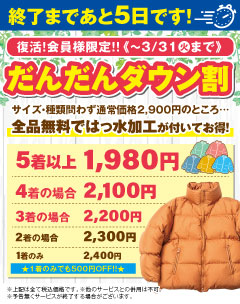 ダウンを最大5着以上まとめてお持ちいただくと1,980円に!!