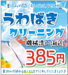 夏休みの間に上履きを洗いませんか? 2025/07/30 夏休みの間に、汚れた上履きをクリーニングで キレイにしませんか? 汚れはもちろん、ニオイもしっかり取れますよ! ***** \1足洗うともう1足が無料に♪/ 当店では毎週金曜日にスニーカークリーニング1+1Dayを 開催中! ぜひ金曜日を狙ってお得にクリーニングしてくださいね!