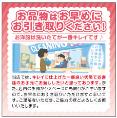 お品物はお早めにお引き取りください! 2025/05/23 いつもご利用いただき、誠にありがとうございます。 クリーニング品は洗いたてが綺麗ですので、 お早目のお引き取りをお願いします。 今後もどうぞよろしくお願い致します。